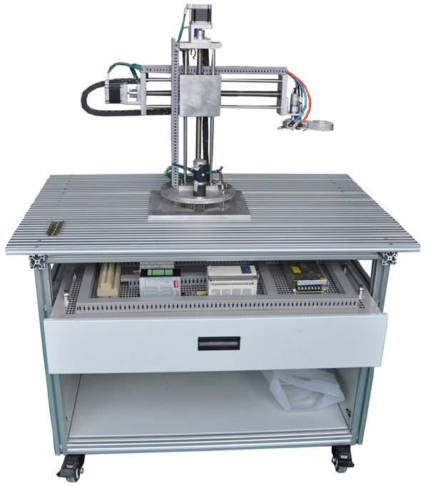十字滑實訓裝置為實際自動倉儲系統(tǒng)的微縮,使用可編程控制器控制,在X、Y、Z軸三個方向上準確地驅動步進電動機進行物品搬運、移動的成品,完善的執(zhí)行機構可實現(xiàn)現(xiàn)代物流系統(tǒng)中全部動作過程。十字滑實訓裝置由鋁合金導軌式實訓臺、機械手裝置、控制系統(tǒng)等組成。實訓裝置為坐標式機械手,可完成機械手旋轉、手臂垂直上下、手臂水平移動,手爪旋轉四個自由度的位置精確控制。同時配置晶體管式PLC可編程控制器,用于對整個機械手進行復雜地位置控制。該實訓裝置的控制部分均采用標準式模塊設計,可分為電源模塊、PLC模塊、系統(tǒng)控制模塊。包含了機電一體化專業(yè)中所涉及的諸如步進電機驅動、機械傳動、氣動、可編程控制器、傳感器、等多項技術,給學生提供了一個綜合實訓環(huán)境,使學生學過的諸多單科專業(yè)知識在這里得到全面認識、綜合訓練和相互提升。