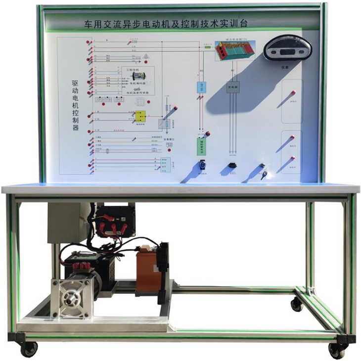 檢測控制面板(裝有各種檢測端子,1448×940mm彩色電路圖和工作原理示意圖)、組合儀表、點火開關、電機控制器、車載充電器與充電接口、DC-DC轉換器、鋰動力電池組、電動車電機(交流異步電動機)、剎車開關、檔位開關、油門控制裝置、大電流繼電器、電源總開關、急停開關、輔助蓄電池(12V45AH)、一體化全鋁合金型材搭建的移動臺架(1500×700×1700mm