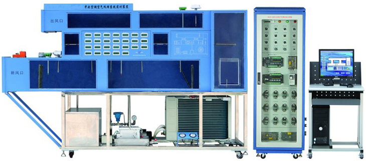 中央空調(diào)系統(tǒng)由實(shí)驗(yàn)臺(tái)、制冷機(jī)組、制熱系統(tǒng)、加濕裝置、空調(diào)箱(風(fēng)道)、冷凍水系統(tǒng)、測(cè)量?jī)x表(包括溫濕度傳感器及風(fēng)速傳感器)、電氣控制系統(tǒng)、模擬熱源等組成。