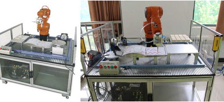 模塊整體臺架材料為優(yōu)質鋁型材,一體畫板由不銹鋼板制成,表面覆蓋PVC膜;具有TCP標定工具,可實現(xiàn)機器人工具TCP標定練習;實現(xiàn)基本軌跡編程練習,提供三角形、矩形、圓形及多線段圖形,訓練不同的編程指令,實現(xiàn)在平面及空間復雜教學軌跡。