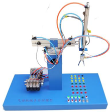 本實訓模型是一套完整的氣動機械手搬運裝置,由安裝底板、氣動手指、單桿提升氣缸、雙導桿伸縮氣缸、旋轉擺動氣缸、多種類型磁性傳感器、多種類型電磁閥、空氣過濾器、氣源控制滑閥及接線端子排等組成。主要完成物料的搬運功能,氣動機械手通過前臂下降,氣動手指夾緊物體,手臂縮回,手臂右擺,手臂前伸,前臂下降,手爪松開將物體放到指定位置等動作后,機械手返回原位。將電磁閥及磁性開關等元件的引出線連接到相應的端子接線排上,方便使用。能滿足職業(yè)院?删幊炭刂破、機電一體化、氣動技術等相關課程的實訓教學。控制電源:DC 24V