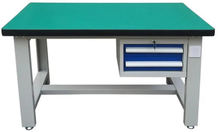 功能:由桌身、工具柜、臺面組成,用于電氣及機械結構的裝配平臺。 尺寸:不小于L1500mm×W700mm×H780mm 桌身:裝配桌預設電源插座擴展孔,依據(jù)用途可加裝電源插座。整個裝配桌可隨意拆裝,方便運輸安裝。 工具柜:采用冷軋鋼板折彎焊接而成,工具柜有多個抽屜,可儲藏工具,放置于裝配桌底部一側。 臺面:采用50mm厚高壓復合成型纖維板,表面覆蓋2mm綠色防靜電膠皮,四邊并以5mm ,PVC截面封邊,臺面具有耐磨、耐熱、耐污及易清潔等特點。具有耐沖擊、耐酸堿、吸震、防靜電的功能