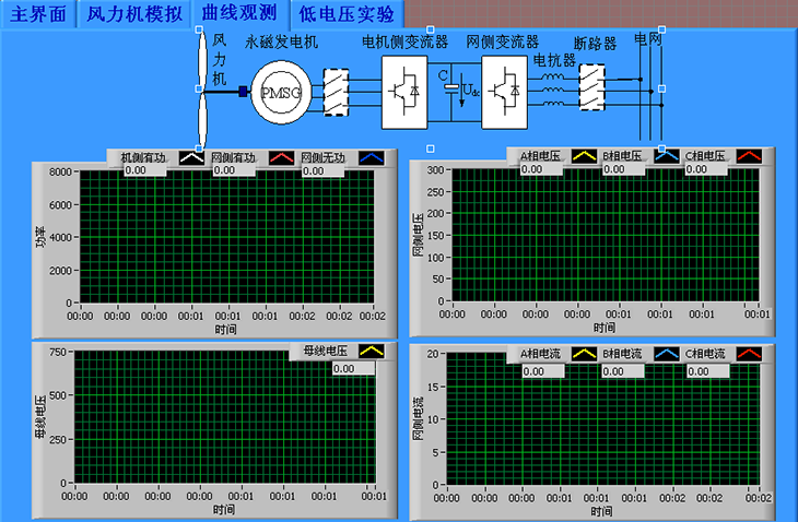 1)模擬真實風力發(fā)電機的啟動、并網(wǎng)、正常運行和停機過程,具備模擬機組變速調(diào)節(jié)能力,有功、無功的調(diào)節(jié)能力;