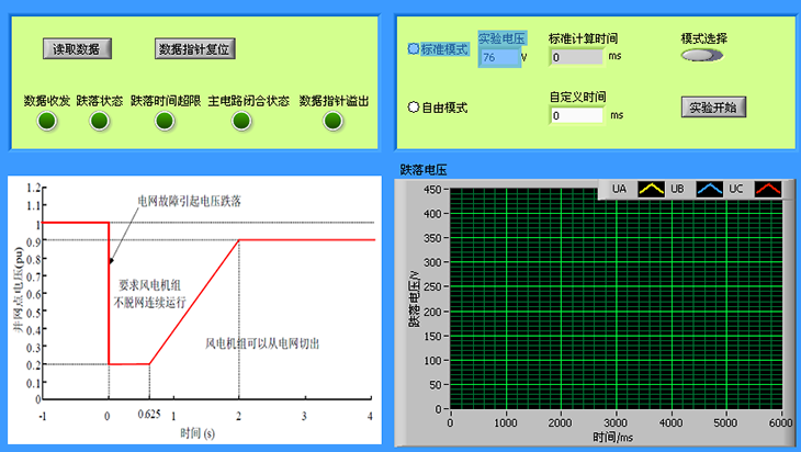 5)背靠背變流器可實現(xiàn)直流側(cè)電壓的初始狀態(tài)進行設(shè)定,實現(xiàn)單位功率因數(shù)并網(wǎng),實現(xiàn)風力發(fā)電機在故障條件下不脫網(wǎng)運行,低電壓穿越的功能,支持風機的低電壓穿越實驗;