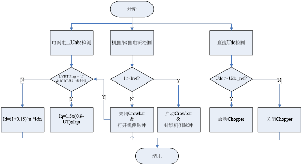 4)實現(xiàn)風速和風力機模擬,機組并網(wǎng)控制,機組最大功率運行控制,機組恒速運行,機組限功率運行,機組低電壓穿越,機組脫網(wǎng)控制等控制功能;