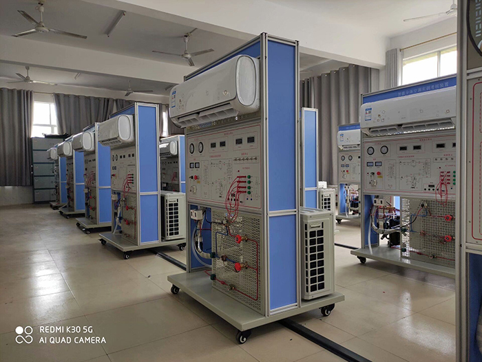 2.、裝置直觀展示了空調(diào)的系統(tǒng)結(jié)構(gòu)和工作原理,便于教學(xué)演示講解及學(xué)生對課本知識的理解掌握。配置的交流電壓表、交流電流表、溫度表、真空壓力表以及相應(yīng)的信號指示燈,使整個空調(diào)系統(tǒng)的實時工作狀態(tài)一目了然;前面板中間印有電氣控制系統(tǒng)原理圖,并設(shè)有相應(yīng)測試點。