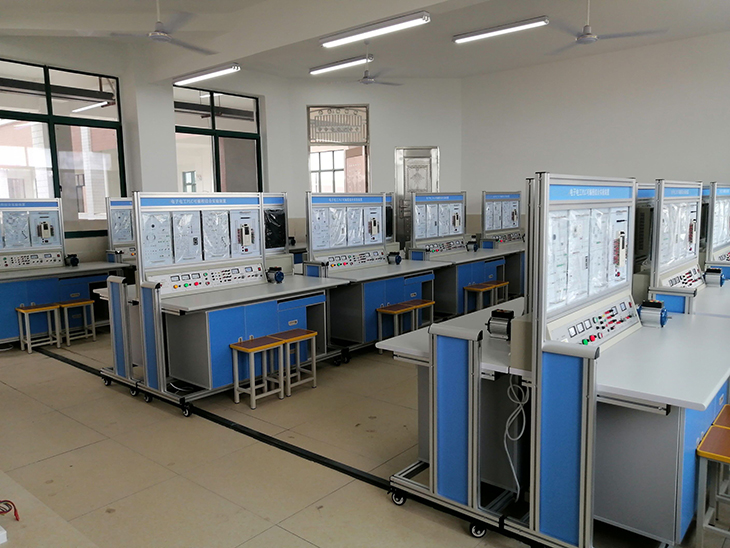 電子電工與PLC實訓室配置有西門子公司S7-1200系列PLC作為控制核心,同時配套有流水燈、港口起重機、十字路交通燈、三層電梯、天塔之光等預設實訓模塊。其附帶有7英寸彩色觸摸屏,通信下載編程電纜,觸摸屏與PLC通信電纜,開發(fā)組態(tài)軟件等配套設備,構建了完全真實的PLC項目開發(fā)環(huán)境,便于學生演練PLC項目開發(fā)的全套流程。同時,實訓設備外掛了電子實訓模塊,可供學生進行電子相關實訓。該實訓室利用多媒體教學、網絡教學等先進手段,將復雜知識點簡單化,將實訓內容與工作任務融合為一,實現(xiàn)了一體化教學的目的。