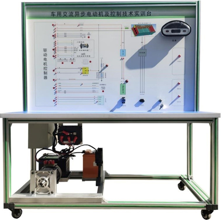 檢測控制面板(裝有各種檢測端子,1448×940mm彩色電路圖和工作原理示意圖)、組合儀表、點火開關(guān)、電機控制器、車載充電器與充電接口、DC-DC轉(zhuǎn)換器、鋰動力電池組、電動車電機(交流異步電動機)、剎車開關(guān)、檔位開關(guān)、油門控制裝置、大電流繼電器、電源總開關(guān)、急停開關(guān)、輔助蓄電池(12V45AH)、一體化全鋁合金型材搭建的移動臺架(1500×700×1700mm
