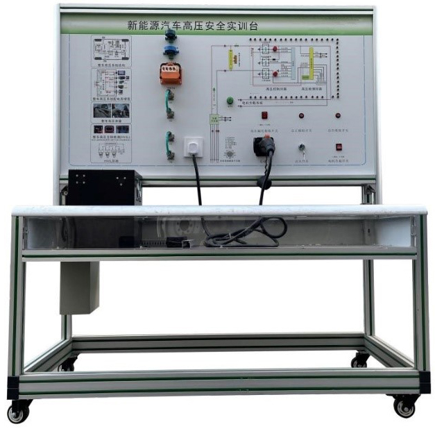 動力電池組、國標充電槍與充電座、漏電傳感器模塊、絕緣傳感器模塊、安全維修塞模塊、漏電模擬操作單元、高壓安全系統(tǒng)操作單元、操作控制臺、訓練控制按鈕、一體化全鋁合金型材搭建的移動臺架(1500×700×1700mm