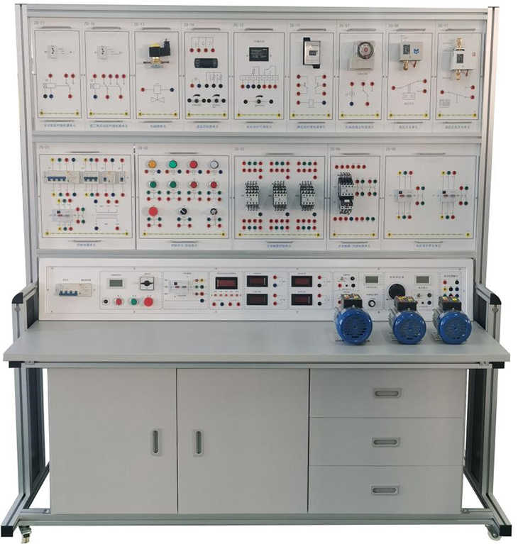 總體結(jié)構(gòu):實訓臺架由實訓桌、電源控制單元、儀表顯示單元等多個部分組成。臺架以經(jīng)氧化處理的高材質(zhì)40mm×80mm鋁合金作為設備主要框架材料;臺架采用鋁合金的本體顏色,電源箱體采用灰色1.2mm鋼板制作。實訓屏底部裝電源控制屏,電源控制屏的面板布局從左至右依次為電源指示和電源控制單元、含電源保護單元、指示燈和按鈕單元、急停開關(guān)、儀表單元、直流電源單元;實訓屏上部采用三根不銹鋼型材組成通用實訓模塊固定結(jié)構(gòu),一次可擺放8個實訓模塊,根據(jù)實訓內(nèi)容的需要調(diào)換實訓模塊。實訓桌桌面采用25mm麻灰色高密度層壓板封邊特制,有效提高絕緣等級。