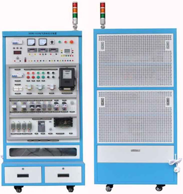 1、電氣控制實訓裝置須采用標準配電柜為主體柜進行改造,充分利用該柜雙面空間位置,其中一面裝有電源控制、交直流電源、測量儀表、變頻器、低壓電氣器件,另一面裝有2塊可方便拆卸的網(wǎng)孔板;