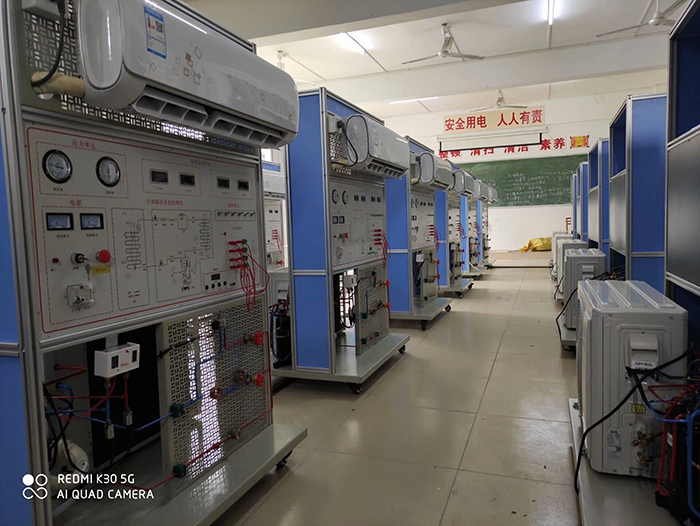 2.、裝置直觀展示了空調(diào)的系統(tǒng)結(jié)構(gòu)和工作原理,便于教學(xué)演示講解及學(xué)生對課本知識的理解掌握。配置的交流電壓表、交流電流表、溫度表、真空壓力表以及相應(yīng)的信號指示燈,使整個空調(diào)系統(tǒng)的實時工作狀態(tài)一目了然;前面板中間印有電氣控制系統(tǒng)原理圖,并設(shè)有相應(yīng)測試點。