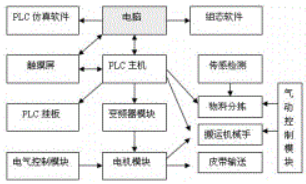 光機電一體化實訓裝置由型材導軌式實訓臺,典型機電一體化設備機械部件,PLC模塊,變頻器模塊,按鈕模塊,電源模塊,低壓電器模塊,模擬生產(chǎn)設備實訓模塊(包含上料機構(gòu),搬運機械手,皮帶輸送線,物件分揀等)接線端子排,各種傳感器,警示燈和氣動電磁閥等組成。整體結(jié)構(gòu)采用開放式和拆裝式設計,學生可以組裝,接線,編程和調(diào)試由上料機構(gòu),搬運機械手機構(gòu),皮帶輸送線和物料分揀組成的光機電一體化設備。裝置的總體結(jié)構(gòu)示意圖如圖主所示。