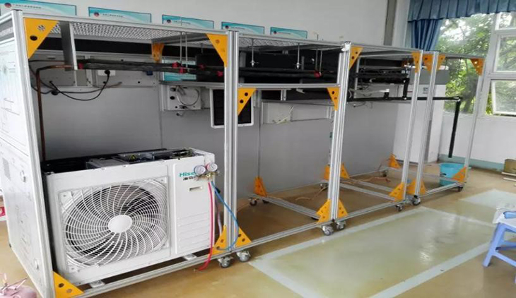 1、安裝實訓架子:實訓裝置采用移動框架4040鋁型材結(jié)構(gòu),底部使用3加有四個固定支撐腳,安裝好后可固定位置,防止移動而牽動制冷系統(tǒng)管路。