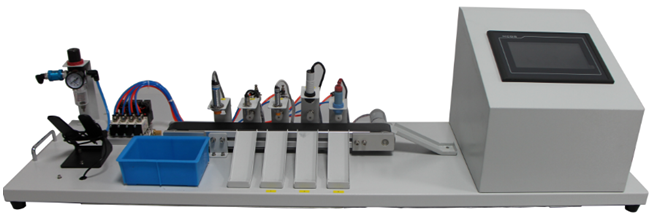 由底板、氣動部分(含靜音氣泵)、物料傳送機構(gòu)、料槽及電氣控制部分等組成。電氣控制部分主要由三相交流電機、電磁閥、氣缸、光電傳感器、電感傳感、電容傳感器等組成。通過傳感器信號采集、PLC編程,對電機、電磁閥進行較復(fù)雜的開關(guān)量控制、時序邏輯控制,完成對物料分揀系統(tǒng)的調(diào)試、二維碼系統(tǒng)調(diào)試及控制,氣動控制技術(shù)應(yīng)用、傳感器技術(shù)應(yīng)用、故障檢測與維修;