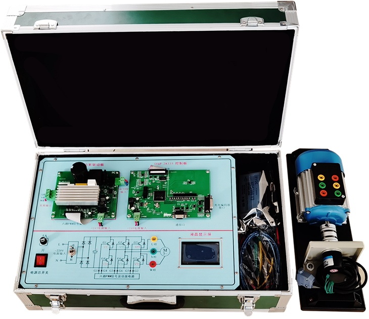 本實驗系統(tǒng)是基于德州儀器TI公司的28335型C2000系列DSP而設計的高性能矢量控制變頻調(diào)速系統(tǒng)。系統(tǒng)由實驗箱(含DSP控制板、IPM智能功率驅動模塊和24V開關電源)、XDS100V2-USB2.0仿真器,三相鼠籠式異步電動機,增量式光電編碼器,聯(lián)軸器,固定電機導軌等組成。