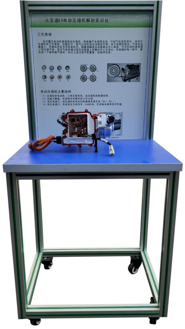 選用主流純電動車配套電動車壓縮機;通過解剖,展示現(xiàn)電動車壓縮機內部結構和控制原理。