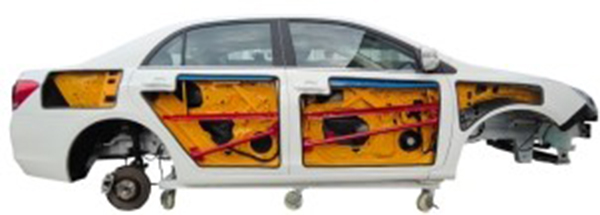 純電動汽車原車解剖車身及車身電器系統(tǒng)組成,對原車前后艙蓋,前后左右門板進行解剖,真實展示車身夾層內部結構,并在解剖面上涂抹防護漆。
