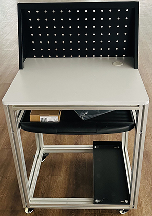 鋼鋁結(jié)構(gòu),裝有4只萬向輪,裝有黑色鋼質(zhì)網(wǎng)孔電腦后靠、鍵盤托、主機(jī)支架。 |