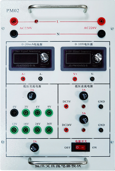 提供3V、6V、9V、12V、18V、24V、36V低壓交流電源一組,直流24V/5A,一路直流5V/3A一組,0-10V電壓源,0-20mA電流源各一組,帶數(shù)顯指示,旋轉(zhuǎn)編碼器調(diào)節(jié)。