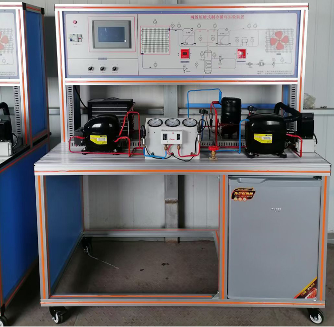 裝置應(yīng)包含數(shù)據(jù)采集系統(tǒng)屏、實(shí)訓(xùn)臺(tái)、交流電源控制、低溫保溫箱體,蒸發(fā)器、冷凝器、高級(jí)壓縮機(jī)、低級(jí)壓縮機(jī)、冷凝風(fēng)扇、中間冷卻系統(tǒng)等,管路中還設(shè)有控制閥等實(shí)訓(xùn)所必需的部件組成的二級(jí)壓壓縮機(jī)循環(huán)制冷系統(tǒng)。