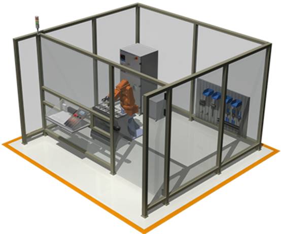 安全護(hù)欄:隔離護(hù)欄,高1000mm,框架采用2mm厚灰色棟梁鋁合金型材,鋼化玻璃10mm厚;工作站全部通透利于觀察,玻璃中間沒有隔斷;并安裝一個(gè)側(cè)開門;門上安裝安全檢測(cè)元件,機(jī)器人自動(dòng)運(yùn)行必須在門關(guān)閉狀態(tài)下進(jìn)行;系統(tǒng)工作站安裝有3個(gè)急停按鈕,分別位于操作控制臺(tái)、模型安裝臺(tái)、隔離護(hù)欄上,以備緊急情況使用。