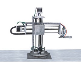 搬運(yùn)機(jī)器人:檢測單元檢測到產(chǎn)品分類信息時(shí),通過通信網(wǎng)絡(luò)將檢測結(jié)果傳送到該站,該站通過坐標(biāo)式氣動(dòng)機(jī)器人將從生產(chǎn)線上送來的成品送往全自動(dòng)堆垛機(jī),主要由四自由度氣動(dòng)機(jī)械手組成,電氣控制部分由PLC完成。