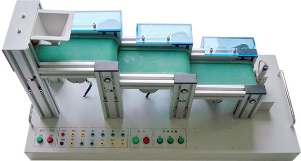 模型主要由漏斗上料裝置、三級(jí)傳送帶、直流電機(jī)、電磁鐵、電容傳感器、開關(guān)、指示燈、鋁型材框架、安裝底板、手柄等組成,通過(guò)PLC編程,可完成自動(dòng)送料裝車系統(tǒng)的模擬控制。