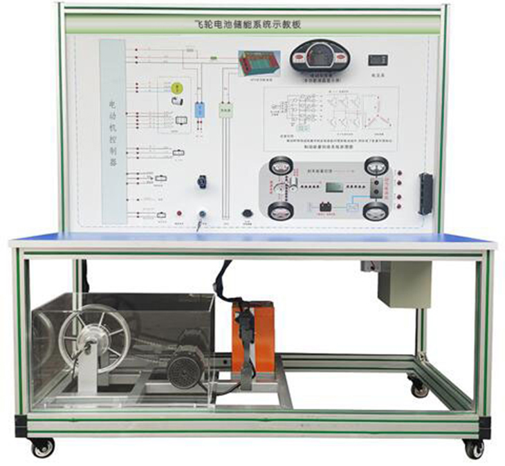 以電動汽車飛輪儲能系統(tǒng)原理為基礎(chǔ)設(shè)計,系統(tǒng)包含動力電源,動力電機,能量回收電機,慣性飛輪儲能裝置、電機驅(qū)動器,油門踏板,剎車開關(guān)、帶電機驅(qū)動系統(tǒng)結(jié)構(gòu)及工作原理的面板,可進行能量回收實驗,可以通過調(diào)節(jié)不同轉(zhuǎn)速實現(xiàn)飛輪儲能,調(diào)節(jié)能量回收開關(guān)即控制電機進行能量回收,通過采集能量回收電機的輸出電量實現(xiàn)采集不同工況下飛輪儲能多少,用來進行飛輪儲能的驗證實驗;