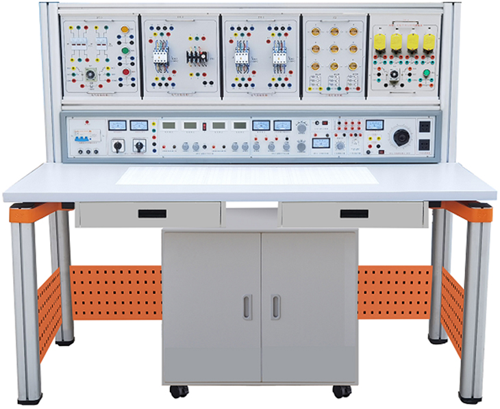 裝置由主機箱、實驗桌、移動矮柜、電氣控制實驗掛箱、實驗掛箱支架、學(xué)生凳等組成。實驗桌可組合、可拆裝。支架與桌腳一體,鋁合金結(jié)構(gòu);電氣控制實驗掛箱及各實驗?zāi)K可根據(jù)實驗需求自由組合實驗。