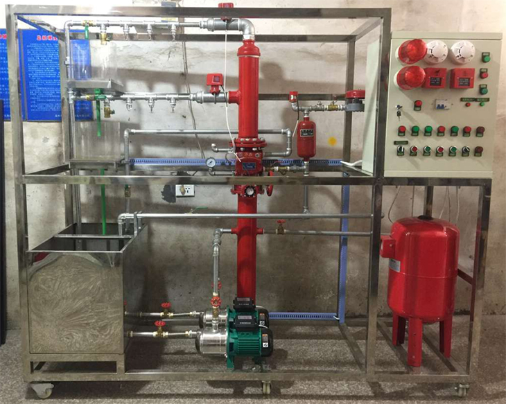 2.模型框架和水箱等主要部件全部使用不銹鋼器件,保證不生銹、不易老化,模擬兩層大樓噴淋滅火系統(tǒng);模型系統(tǒng)主要由噴淋水泵、氣壓罐、濕式報(bào)警閥、水力警鈴、延時(shí)器、壓力開(kāi)關(guān)、水流指示器、封閉式噴頭、試驗(yàn)閥、火災(zāi)探測(cè)器、火災(zāi)報(bào)警器等典型噴水滅火設(shè)備構(gòu)成,能生動(dòng)模擬大樓內(nèi)水滅火系統(tǒng)的典型結(jié)構(gòu)。