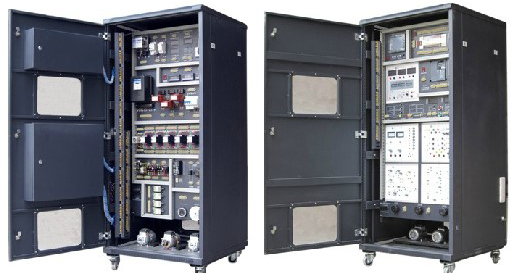該種維修電工教學柜式實訓考核裝置,包括有柜架、觀察窗、儀表操作盤、電氣系統(tǒng)、電機機組組成,所說的電氣系統(tǒng)由多個部分前后面板縱向展開排列,包括觸摸屏部分、PLC主機部分、變頻器部分、電力電子部分、直流電源部分、電力拖動與繼電控制部分,電機軸功率、力矩、轉(zhuǎn)速測量部分,交直流電壓、電流,單三相交流電能、交流功率、功率因數(shù)測量部分等組成。