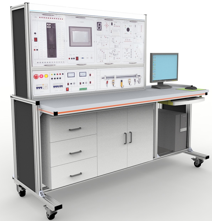 2、臺架構成:實訓臺采用工業(yè)鋁型材加工。桌面下面放置儲物柜,左側(cè)有3層抽屜,用于存放工具以及實訓資料,右側(cè)為雙拉門式設計,可以放置實訓掛箱。底部裝有四個帶鎖止功能的萬向輪。柜體后下側(cè)留有電源輸入線。預留計算機放置位置。