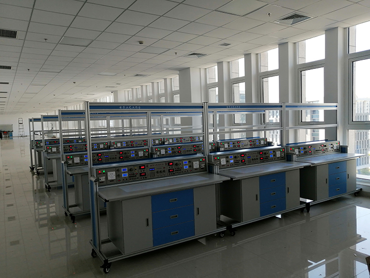 采用工業(yè)鋁合金型材框架,在電源控制屏上方為兩層結(jié)構(gòu)。其中第一層既可放置外配儀器儀表,也可掛放其它通用電工電子實訓(xùn)掛箱,擴展完成多門課程實訓(xùn);第二層可放置PVC夾板,用來夾放實訓(xùn)圖紙。實訓(xùn)臺下方還設(shè)有四個帶剎車的萬向輪,便于移動和固定。