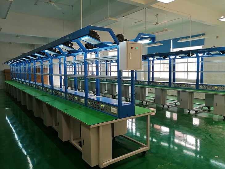 實(shí)訓(xùn)臺(tái)上提供日光燈(用于照明)2個(gè),透明的PVC板4個(gè),可夾放原理圖等資料,另外還配備三芯雙聯(lián)暗插座4個(gè)、兩芯暗插座2個(gè)、工具柜2個(gè),工作臺(tái)面設(shè)有綠色防靜電桌墊,整個(gè)裝配線安全可靠。