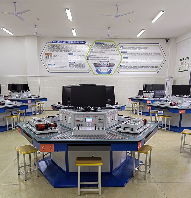 技能工作島由六邊形工作臺、六邊形電源控制屏及典型工作任務組成,能同時容納6名學生在設備上進行操作。