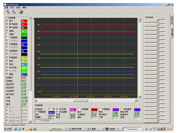 2)、軟件控制,能在線控制系統(tǒng)的溫度,讀取機(jī)組在最佳溫度系統(tǒng)制冷冷媒的流量開度數(shù),調(diào)整制冷機(jī)組的過熱度,過冷度。該文本顯示界面的左側(cè),以文本的形式實(shí)時(shí)顯示當(dāng)前機(jī)組的運(yùn)行數(shù)據(jù)。在界面右側(cè)的上半部分,是對(duì)通訊信息的顯示,包括通訊角色及通訊端口的設(shè)定值以及對(duì)當(dāng)前通訊狀態(tài)的顯示。在界面右側(cè)的下半部分"數(shù)據(jù)信息"中,顯示當(dāng)前接收到哪種數(shù)據(jù)幀、接收到的數(shù)據(jù)幀的地址、等信息。具有上位機(jī)調(diào)節(jié)的線上和手動(dòng)調(diào)節(jié)功能: