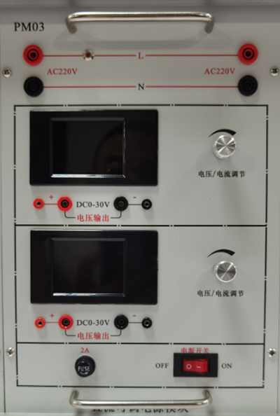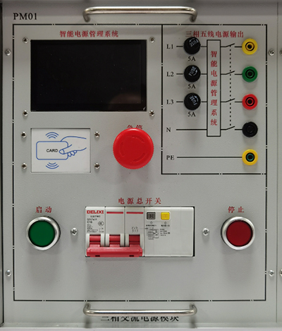 (1)提供線電壓380V交流電源、相電壓220V交流電源。交流電源輸出設(shè)有電源保護(hù)系統(tǒng),相間、線間過電流及直接短路均能自動保護(hù)。提供三相漏電保護(hù)器作為整個實驗平臺的電源總開關(guān)。三相輸出通過停止和啟動按鈕控制。