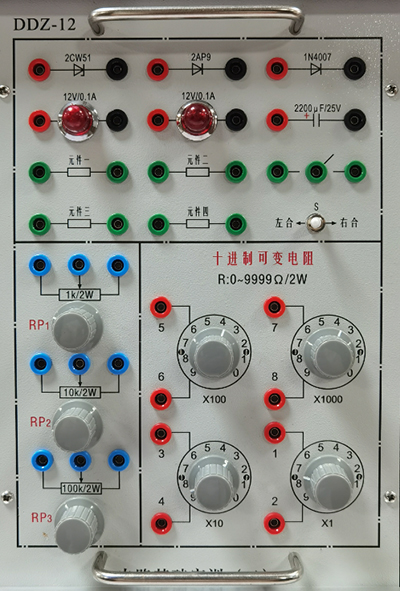 提供各種功率電阻、燈泡(12V/0.1A)、穩(wěn)壓管(2CW51)、二極管、電位器(1k/2W、10k/2W、100k各一只)、電阻箱(0~9Ω/2W、0~90Ω/2W、0~900Ω/2W、0~9000Ω/2W各一組)等。