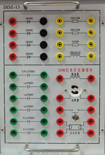 提供0.22uF/500V、0.47uF/500V、1uF/500V(三只)、2.2uF/500V、4.7uF/500V高壓電容、鎮(zhèn)流器、啟輝器、日光燈等,高壓電容可通過鈕子開關(guān)控制,完成日光燈電路連接和功率因數(shù)提高實驗。