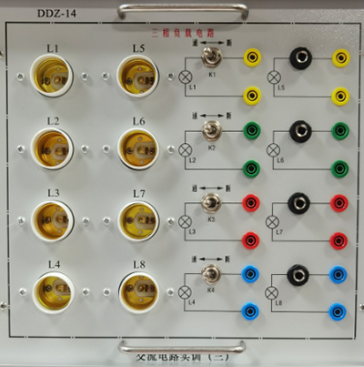 提供四組負(fù)載和四組獨(dú)立的電流插座。每組負(fù)載由兩個獨(dú)立的白熾燈螺口燈座組成(每組設(shè)有一個開關(guān)與一個電流插座)。可插60W以下的白熾燈八只。能夠完成三相交流電路實驗。