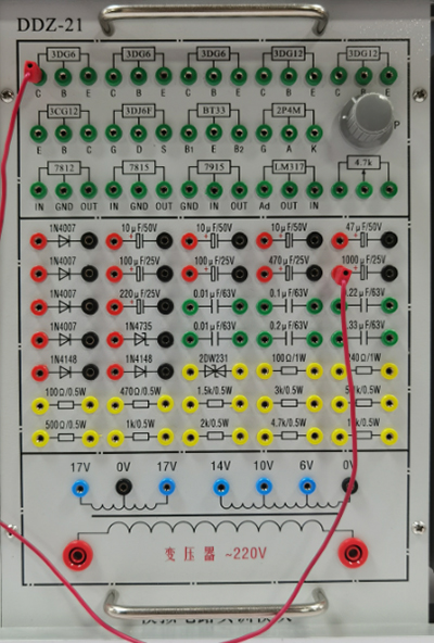 提供低壓交流電源(0V、6V、10V、14V抽頭各一路及中心抽頭17V兩路)、三極管(3DG6、3DG12、3CG12)、二極管(1N4007、1N4148)、穩(wěn)壓塊(7812、7815、7915、LM317)、電阻、單結(jié)晶體管、蜂鳴器、電容等。配有相關(guān)實驗元器件。