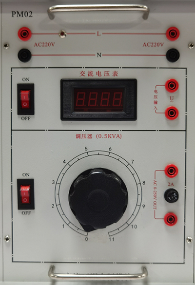 提供0~250V連續(xù)可調(diào)交流電源一路,數(shù)顯電壓變顯示輸出電壓值,輸出具有短路、過流保護(hù)等功能。提供交流電壓表一只,測量范圍0~500V,三位半顯示,能夠測量輸入交流電壓。