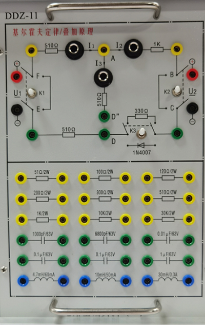提供電阻、電感、電容、電路基礎(chǔ)實驗?zāi)K和故障按鍵(3個)等,完成疊加定理、基爾霍夫定律、戴維南定理、諾頓定理、電壓源與電流源的等效變換、一階、二階電路過渡過程的研究、RLC串聯(lián)諧振電路的研究等實驗。