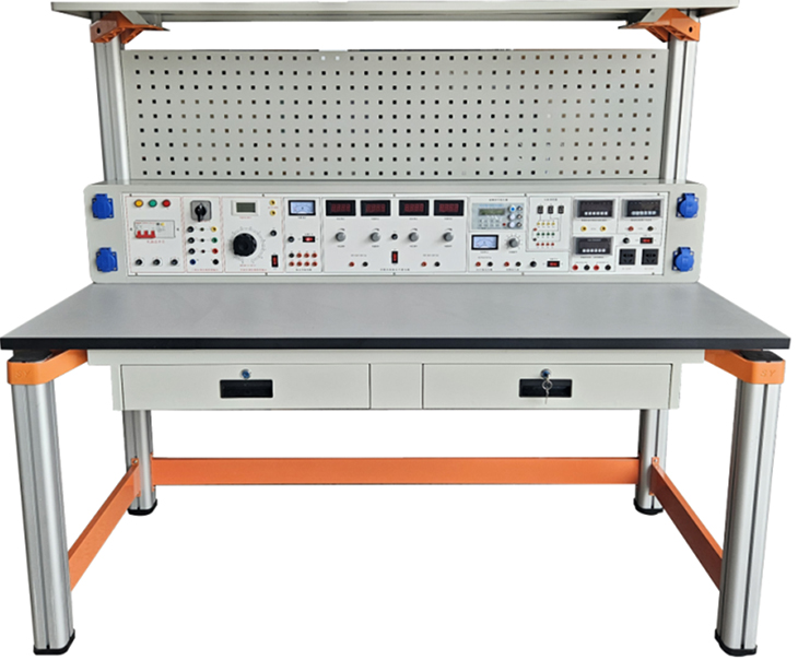 實(shí)訓(xùn)桌后面二支截面尺寸70×70mm桌腳向上延伸,與一次成型鋁壓鑄框架連接構(gòu)件構(gòu)成(非焊接工藝)牢固的支架,與網(wǎng)孔工具掛板、儀器架、電源控制箱組成一個(gè)完整的實(shí)訓(xùn)屏。