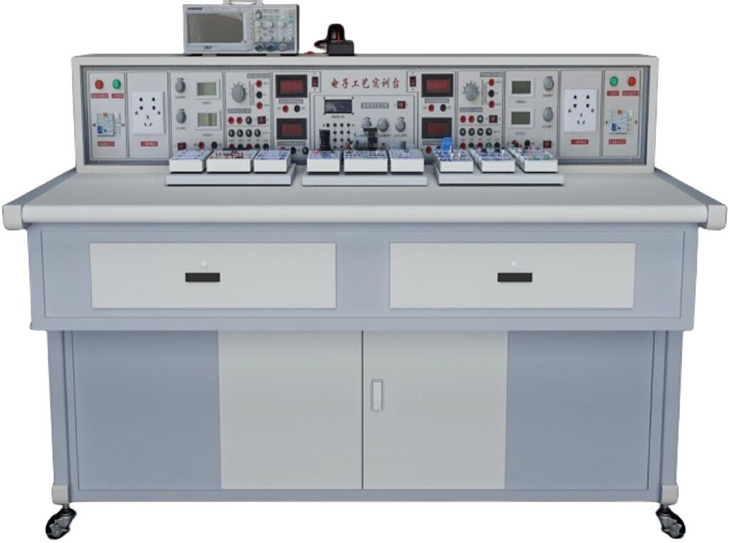 實訓桌為鐵質(zhì)雙層亞光密紋噴塑結構,桌面為防火、防水、耐磨高密度板,結構堅固。實訓桌下方設有柜子,可以放置實訓模塊和工具以及資料等,還設有四個帶剎車的輪子,便于移動和固定。