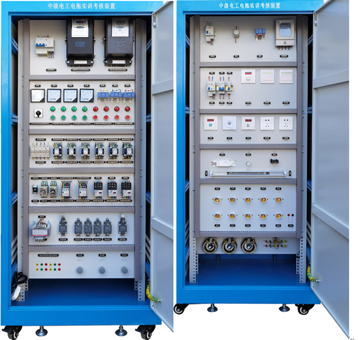 中級電工、電拖實訓考核裝置按標準電氣控制柜設計制造規(guī)格,充分利用雙面位置,柜內(nèi)裝有完成各種照明電路所需的單相電度表、日光燈、單聯(lián)開關、插座、感應開關、漏電開關等,以及電氣控制所需要的多種低壓電器,如漏電斷路器、熔斷器、電流互感器、交流接觸器、時間繼電器、熱繼電器、中間繼電器、行程開關、按鈕、信號燈、轉(zhuǎn)換開關、電壓表、電流表、功率表及電度表等,為了延長電器使用壽命,各電器的接點都與接線端子相連,再由接線端子與被控制電氣連接。