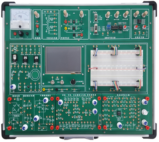 含機(jī)箱、工作電源、常用模擬信號(hào)源、實(shí)驗(yàn)電路區(qū)和分立元件和測(cè)量儀器等 |