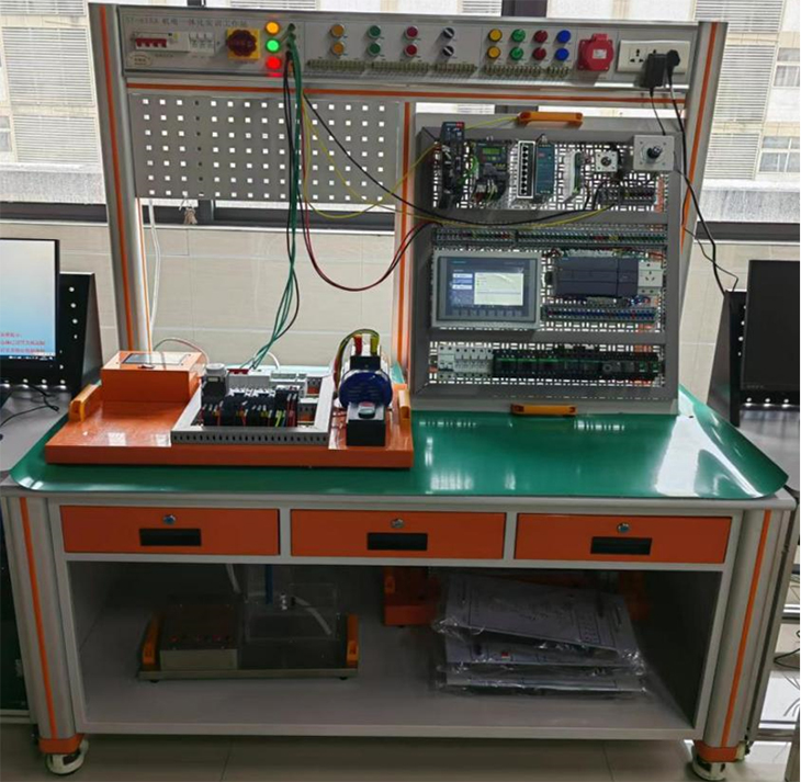 電氣自動化高級實訓平臺包含實訓平臺、控制掛板、應用模塊、電腦桌、圓凳三部分組成,實訓平臺采用優(yōu)質鋁型材做骨架,鋁型材立柱與實訓桌面連接。左右兩側及后面封裝優(yōu)質鋼板,正面設計儲物柜與抽屜。