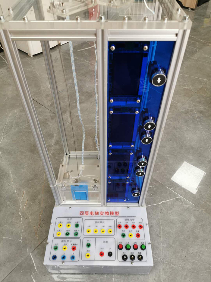 微型四層電梯模型,基本具備實際電梯的所有功能。具有轎廂的升降和轎廂門的開與關功能的拖動系統(tǒng),可采集現(xiàn)場的各種信號,如內選按鈕信號、外選按鈕信號、平層、限位信號、廂門限位信號,實現(xiàn)各種方式下電梯運行的邏輯控制功能?勺鳛PLC、單片機的被控對象使用。具有性能可靠、運行平穩(wěn)、操作簡單、能耗低和便于實訓教學。